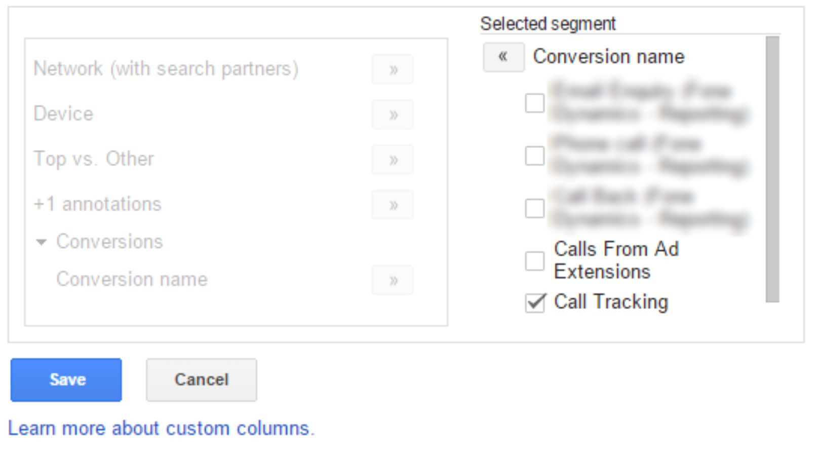 In the Selected segment area tick the box next to Call Tracking and then click Save.