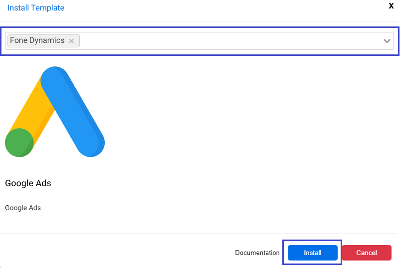 From the pop out window, specify the Project you would like the Google Ads template installed into by using the dropdown menu & then selecting Install