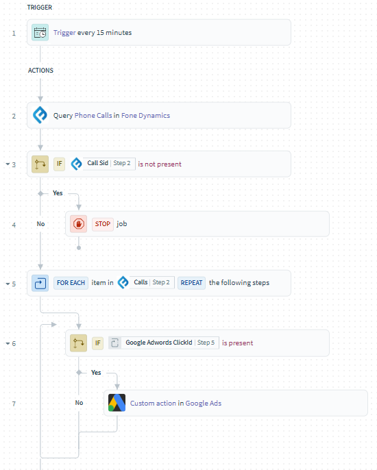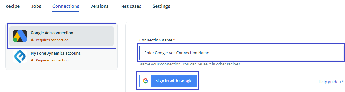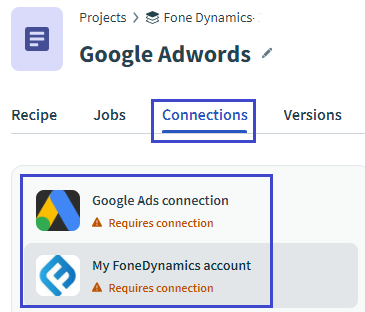 Now click on the Connections tab in the top bar to configure the FoneDynamics and Google Ads Connections for this Recipe: