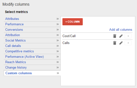 In the pop-up window that opens, name the column Cost/Call and in the Metric drop down list select Conversions -> Cost / conv.