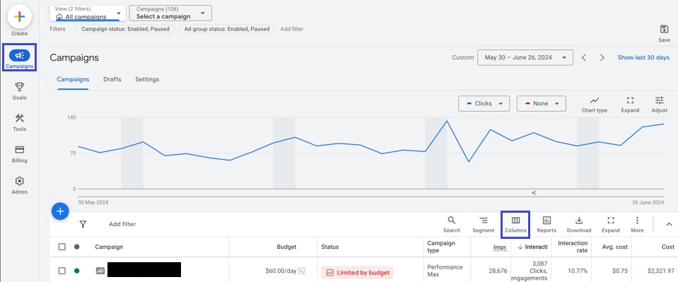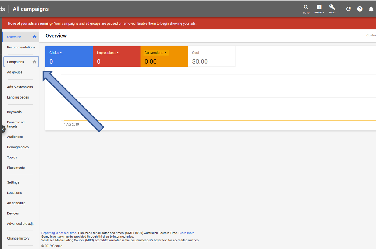 Log into AdWords and click on the Campaigns tab on the left hand side bar