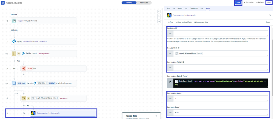 Now with the connections established, we’ll need to configure a few steps in the recipe