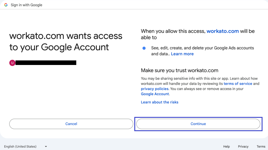Review the terms of service & privacy policies & then click Continue