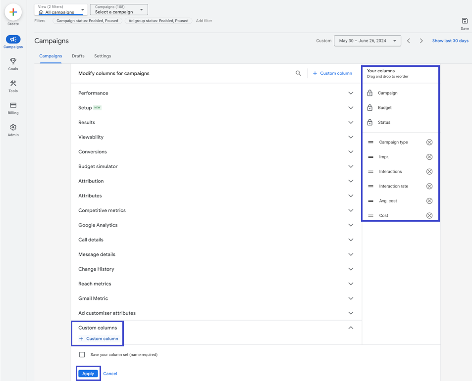 Finally make sure that all of the new columns have been added to the list on the right to ensure they will be added to your table. If not click on the >> next to the columns that are missing. Click Apply to add these new columns.
