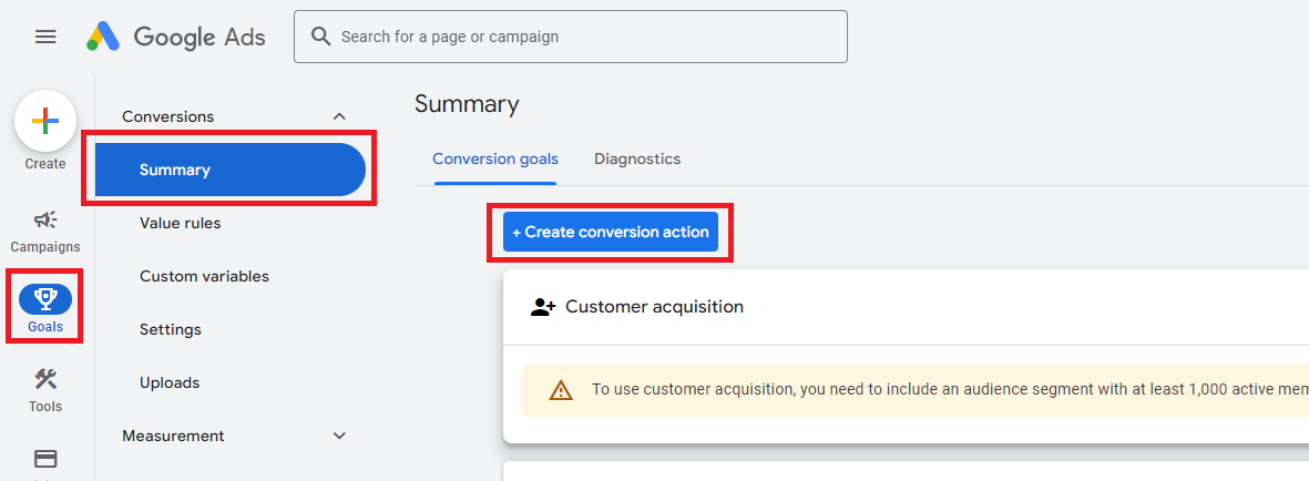 Click on 'Goals', and under Summary click 'Create conversion action'.