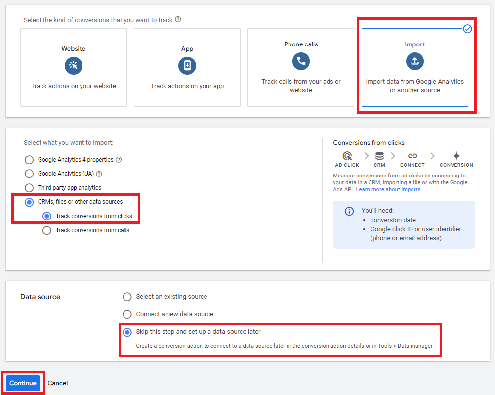 On the next section, click "Import" > "CRMs, files or other data sources" > "Track conversions from clicks" > "Skip this step and set up a data source later" > "Continue".