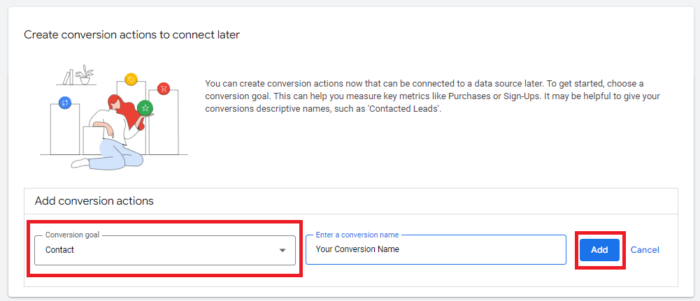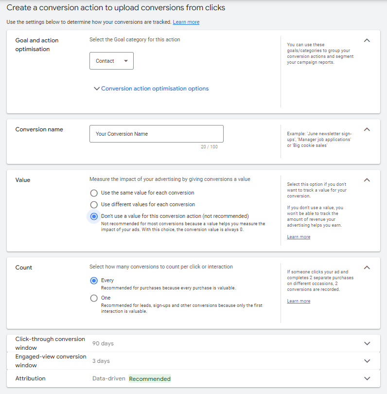 Next, select "Contact" or "Converted lead" as the conversion goal and the name of your conversion.