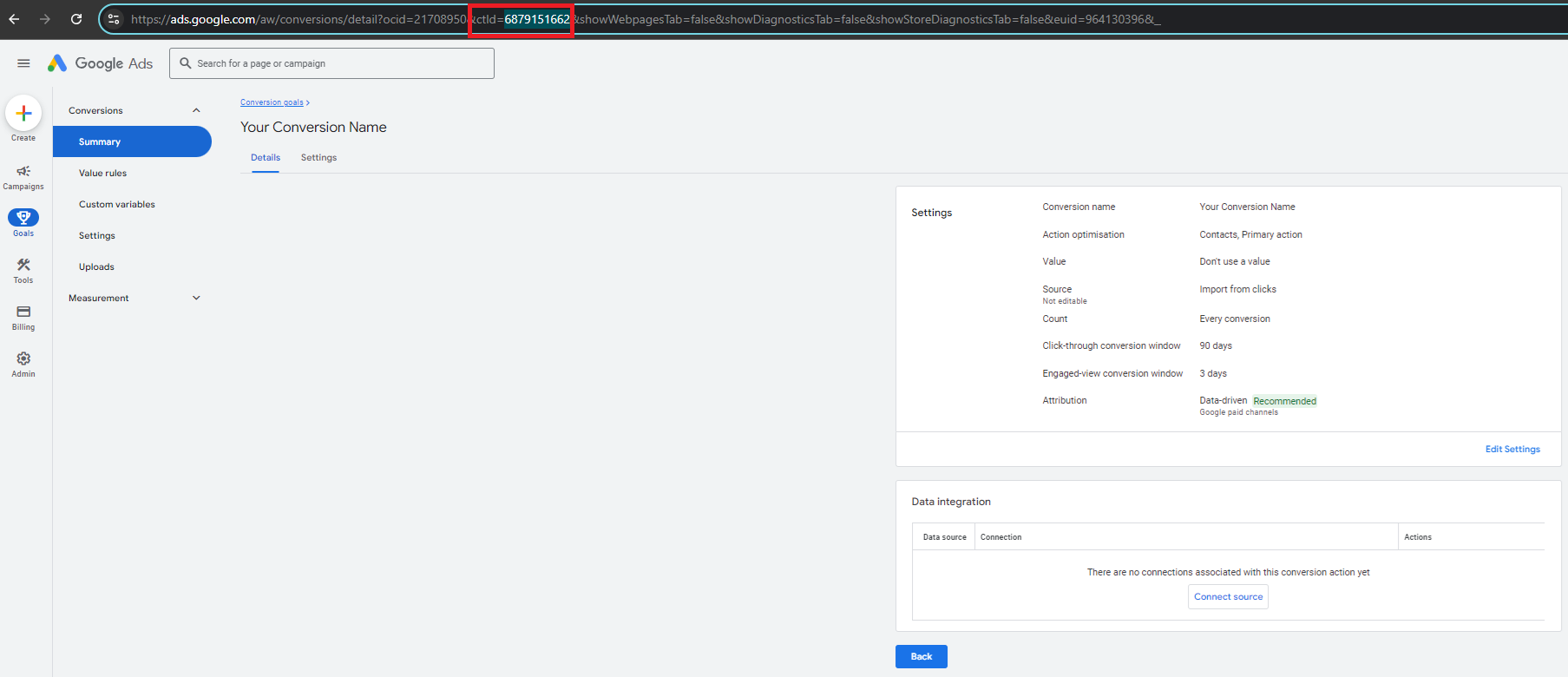 To make sure you have the correct Conversion Action ID, go inside the conversion and check the URL for the number after "ctld".