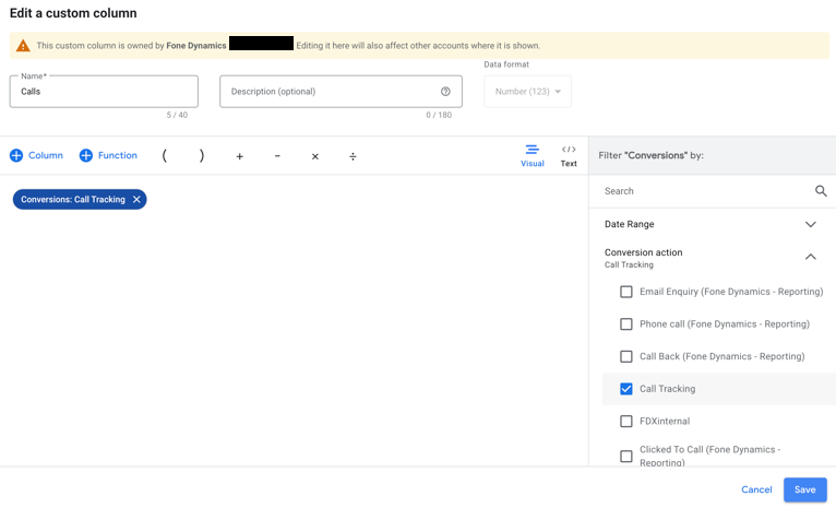 In the pop-up window that opens, name the column Calls and in the Metric drop down list select Conversions -> Conversions.
