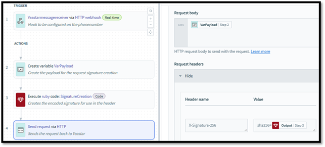 - Now that the payload is created, it must be in the format which is acceptable to Yeastar. SignatureCreation block creates the authentication header used to authenticate the HTTP request.