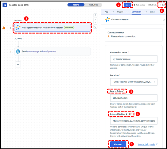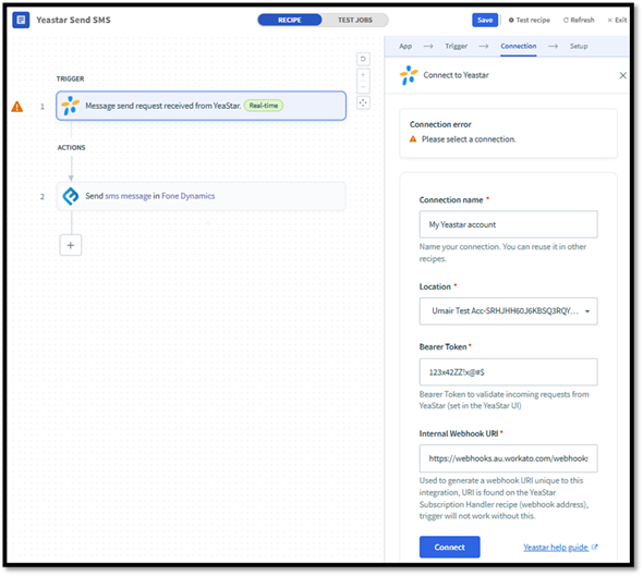 While setting up the connection to the custom Yeastar connector you will need the Bearer Token which is the API key you have setup in Messaging channel in the Yeastar. You will also need the Internal Webhook URI which you will get from Subscription Handler recipe in section 8.3.